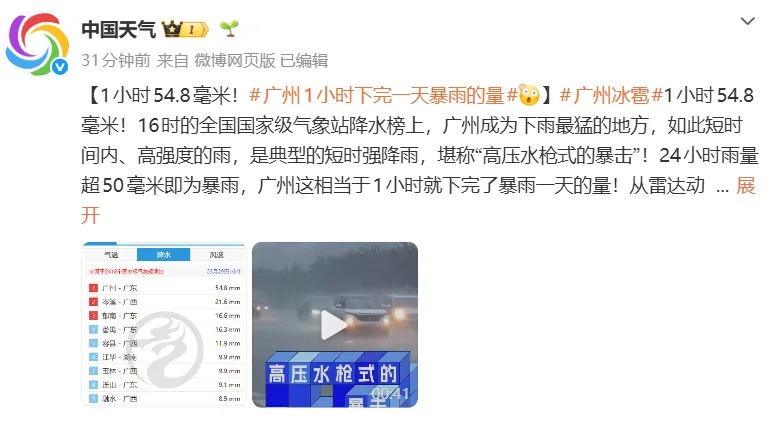 据@中国天气最新消息,16时的全国国家级气象站降水榜上,广州成为下雨最猛的地方,1小时54.8毫米!
