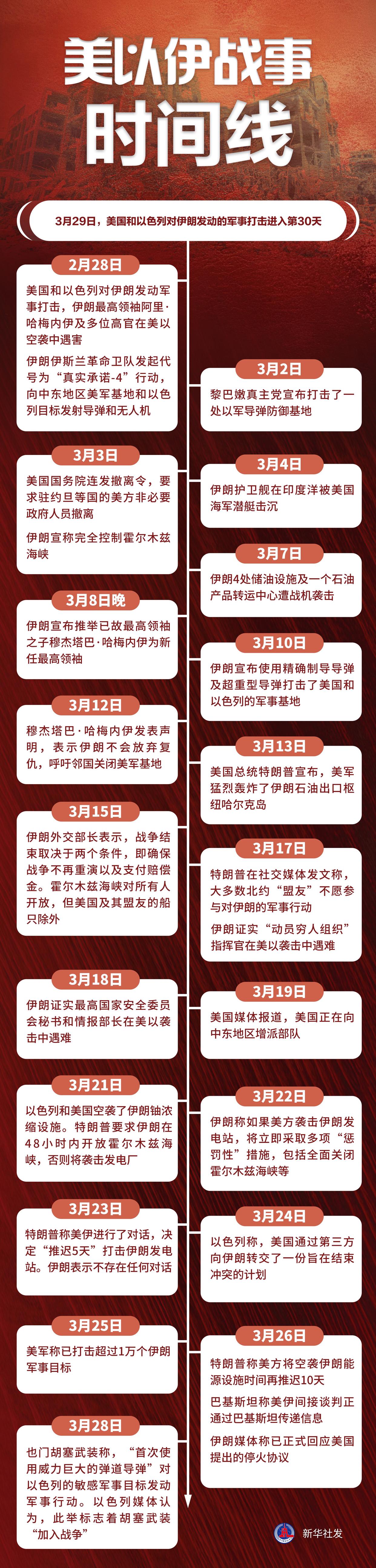 3月29日,美国和以色列对伊朗发动的军事打击进入第30天。美以与伊朗继续相互打击,中东地区局势持续紧张。图表为2月28日以来美以伊战事时间线。
