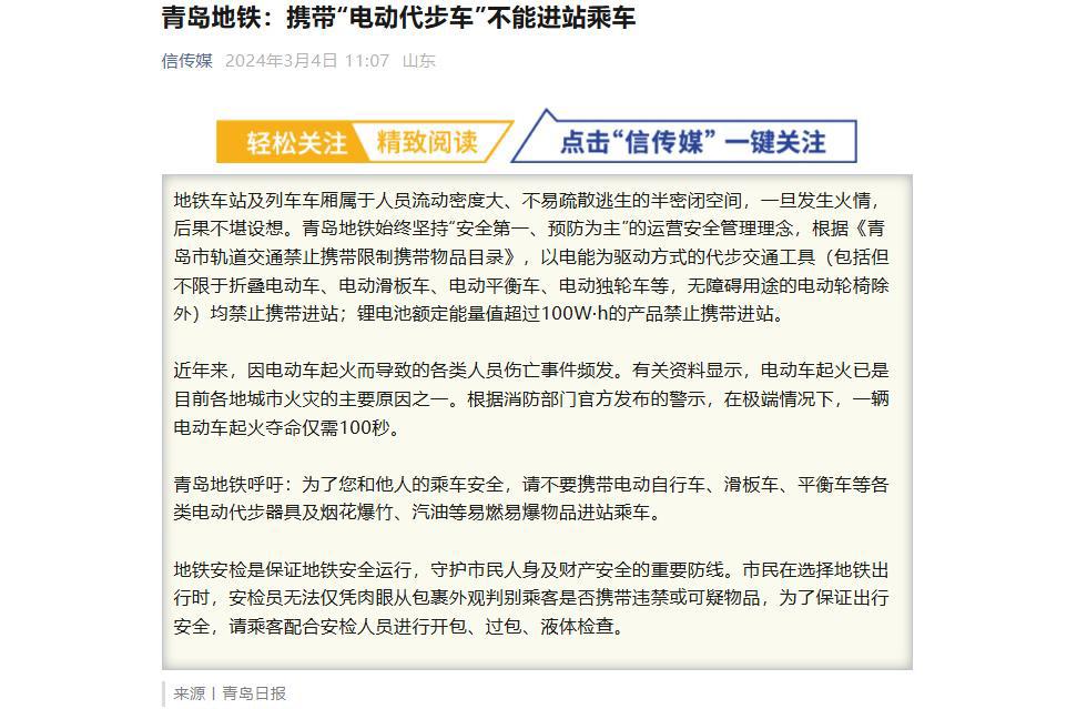 极目新闻记者注意到,青岛本地媒体也曾以《青岛地铁:携带“电动代步车”不能进站乘车》为标题,发布相关报道。
