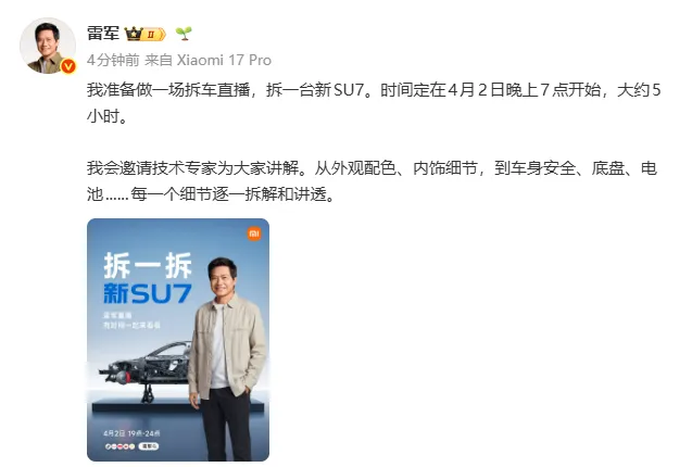 我准备做一场拆车直播,拆一台新SU7。时间定在4月2日晚上7点开始,大约5小时。我会邀请技术专家为大家讲解。从外观配色、内饰细节,到车身安全、底盘、电池......每一个细节逐一拆解和讲透。