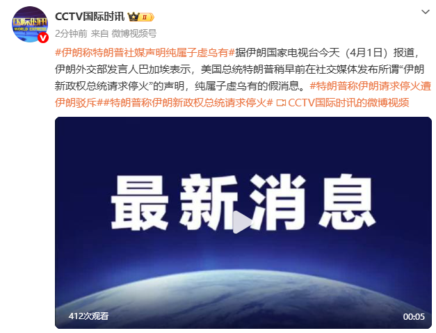 据伊朗国家电视台今天(4月1日)报道,伊朗外交部发言人巴加埃表示,美国总统特朗普稍早前在社交媒体发布所谓“伊朗新政权总统请求停火”的声明,纯属子虚乌有的假消息。
