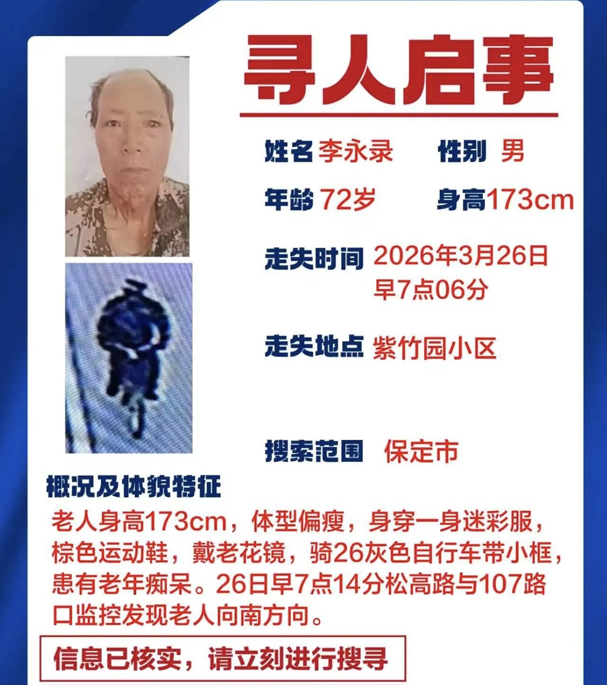 “他记性不好,身上也没带手机、身份证,只有几十块零钱。”李先生说,监控画面显示,老人最后出现于3月26日下午4时,骑自行车出现在涞水县一处鱼塘附近。该地点距离紫竹园小区约35公里,距离老家村子也有27公里。