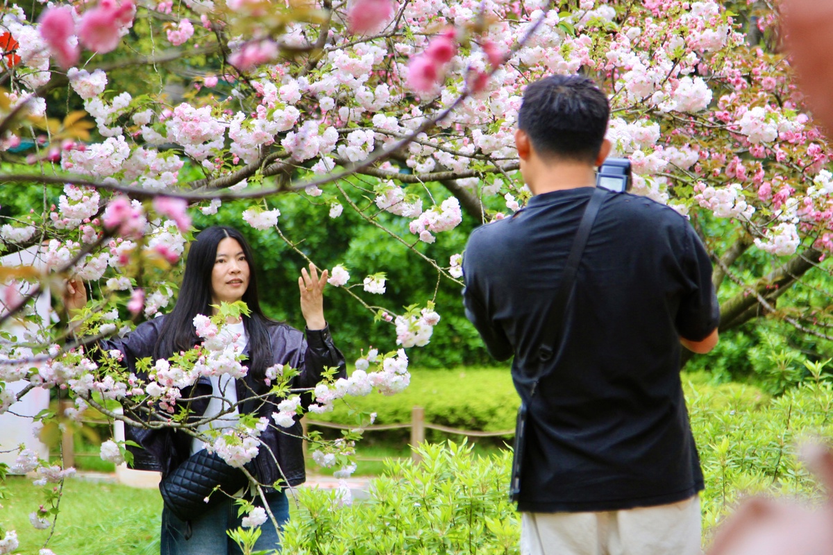 园内郁金、御衣黄、关山、松月、普贤象、太白等晚樱品种各具风情:郁金、御衣黄作为珍稀绿樱,清新雅致;关山、松月等品种或绯红热烈,或粉白柔美,缀满枝头。