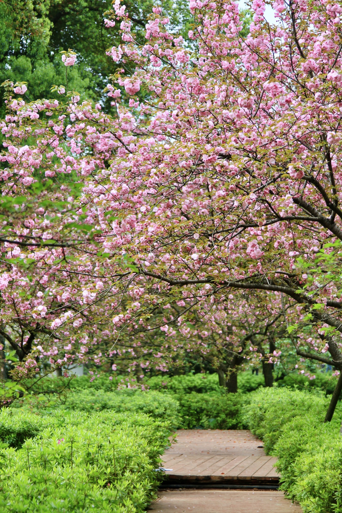 樱花园西区、唐风五重塔后方、飞越丛林、华莲池等地是最佳打卡地。西区晚樱聚集,与亭台溪水相映;唐风五重塔后,晚樱与古建同框,氛围感拉满;飞越丛林附近,晚樱与林间花草交织,野趣十足。
