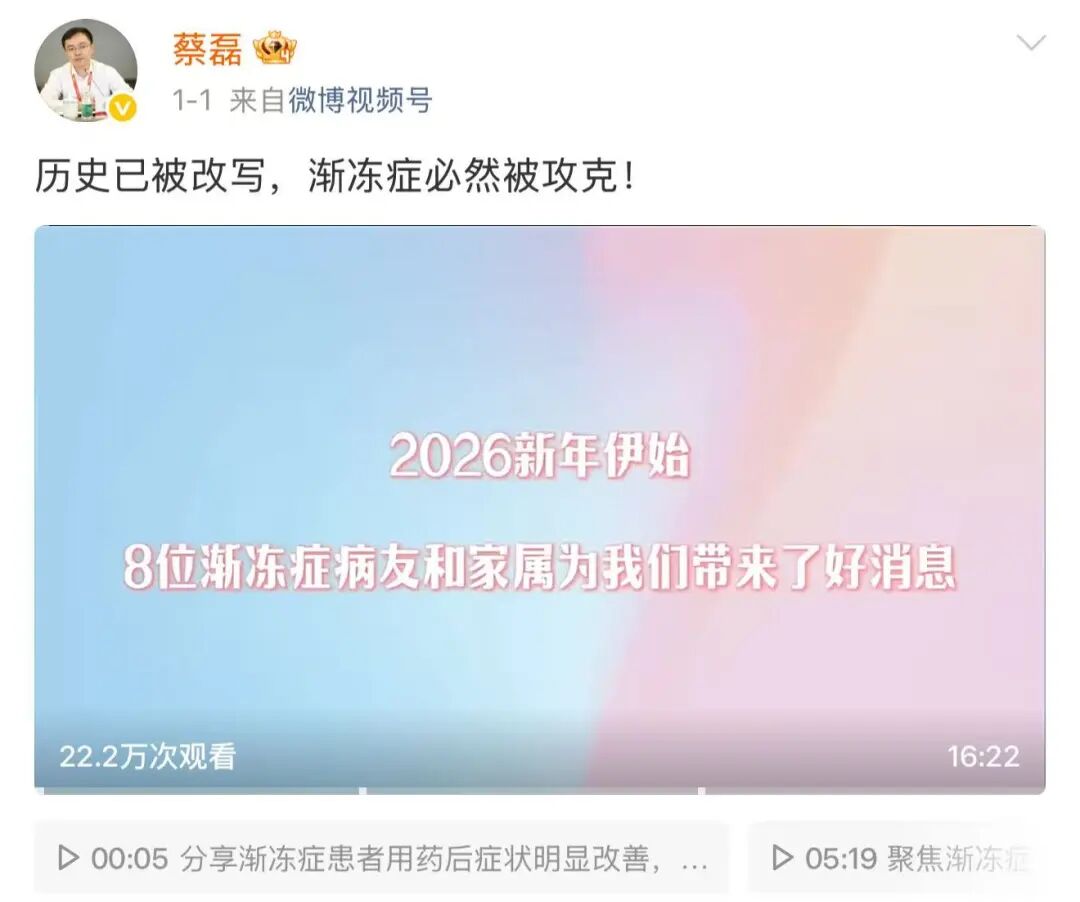 据中国青年报2月11日报道,2026年年初,蔡磊的ALSFRS-R评分(渐冻症功能评分)已降至个位数。被诊断渐冻症6年来,他的身体被一寸寸冻结,四肢和躯干肌肉的力量早已丧失。食物要打成糊状,再过两遍细筛,才能适应他微弱的吞咽功能。