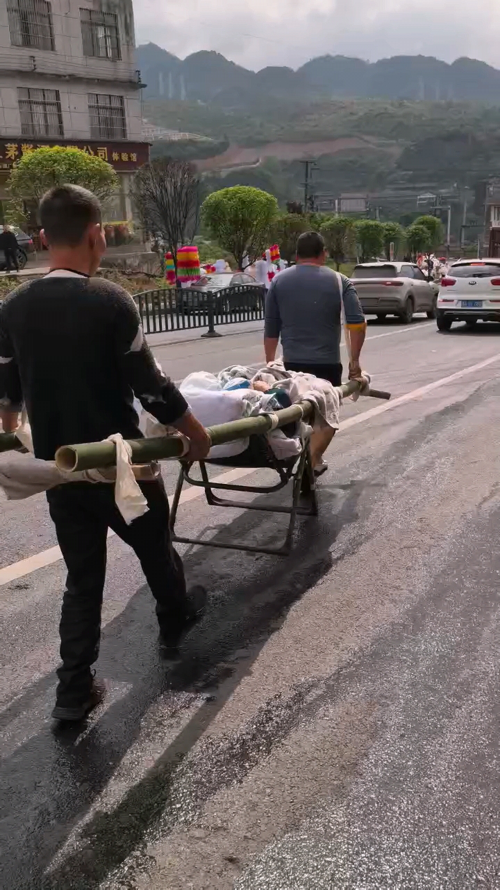 刘秀称,他们将竹竿固定在躺椅两侧,老人躺在椅子上,两个人一前一后抬起竹竿,“我们后面跟了两辆车,抬的人累了就换,换下来的人坐车休息。”