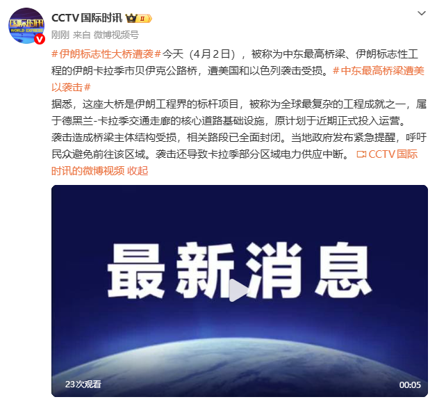 4月2日,被称为中东最高桥梁、伊朗标志性工程的伊朗卡拉季市贝伊克公路桥,遭美国和以色列袭击受损。据悉,这座大桥是伊朗工程界的标杆项目,被称为全球最复杂的工程成就之一,属于德黑兰-卡拉季交通走廊的核心道路基础设施,原计划于近期正式投入运营。