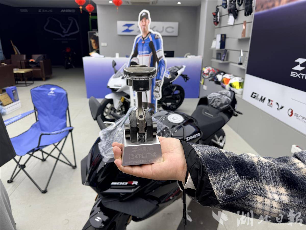 谈及夺冠和品牌热度,店长难掩自豪,但也感到责任重大:“我们肯定很开心,但责任更大了,要服务好未来这么多车主,特别是售后。”他指着店内一个特殊的奖杯——由测试车的活塞零件制成的纪念品,笑着说:“张总就爱搞这些有新意的东西。他还说今年一定要来武汉。”