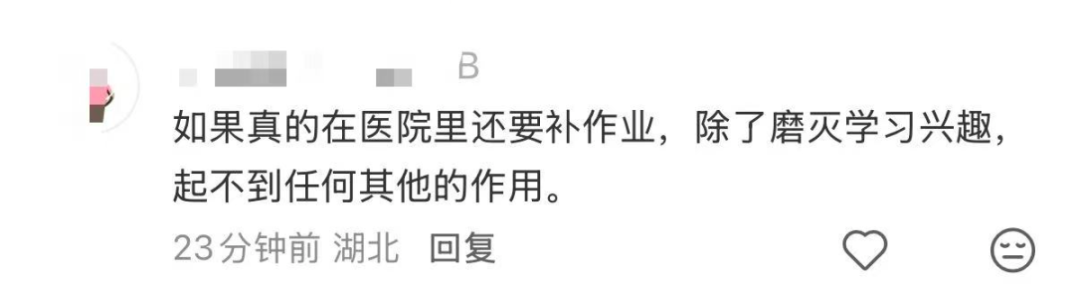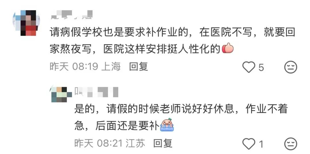 “上次带孩子来医院,都是蹲在地上、把作业本放在椅子上做作业的孩子们。今天来,新增了一排书桌椅,很多人说太卷了,生病了还要做作业,但作为家长来说,真的觉得这个桌椅是刚需,有些病是需要来看的,但确实也不影响做作业的,能排队时候做掉些作业,晚上也能早点睡觉 。”