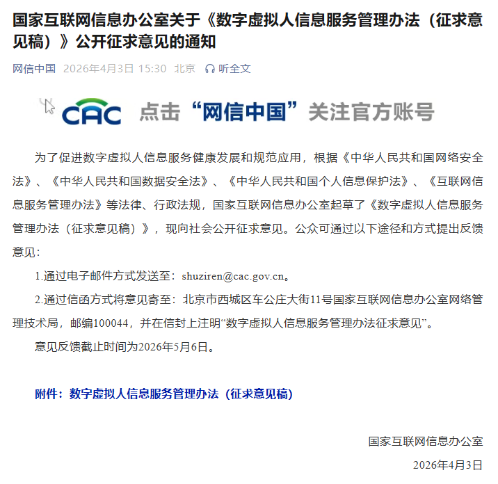 为了促进数字虚拟人信息服务健康发展和规范应用,根据《中华人民共和国网络安全法》、《中华人民共和国数据安全法》、《中华人民共和国个人信息保护法》、《互联网信息服务管理办法》等法律、行政法规,国家互联网信息办公室起草了《数字虚拟人信息服务管理办法(征求意见稿)》,现向社会公开征求意见。公众可通过以下途径和方式提出反馈意见: