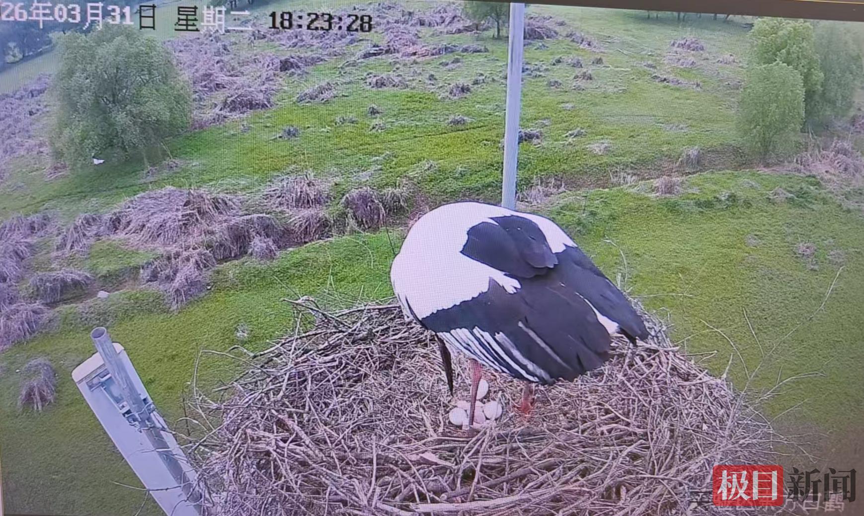 极目新闻记者了解到,此次监控拍摄到东方白鹳产卵并非首次。去年,有一对东方白鹳在保护区繁衍,但产卵3枚后未能孵化成功。