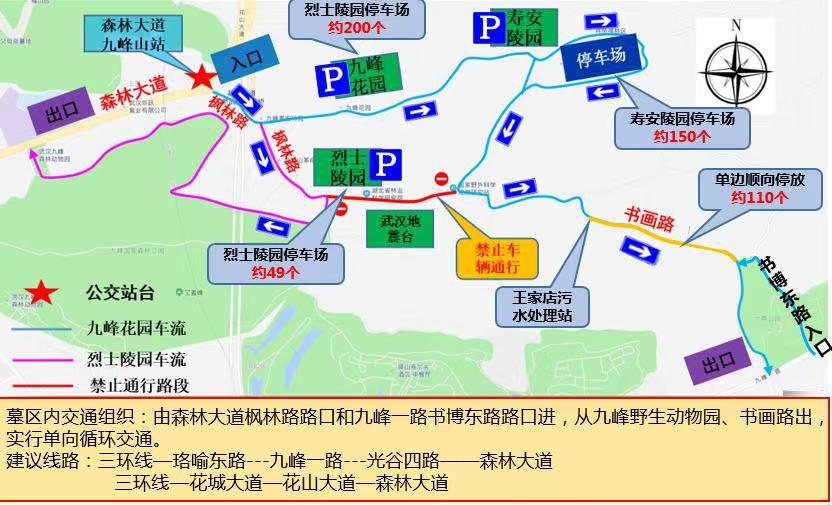 交通管理措施如下:4月4日、5日、6日每日7:00至15:00,机动车一律由森林大道枫林路口(寿安陵园)进入,从九峰野生动物园路口、九峰一路书画路出,实行单向循环交通。书画路(九峰一路至堤顶路)由北向南单向通行、书博东路(九峰一路至堤顶路)由南向北单向通行、堤顶路(书博东路至书画路)由东向西单向通行。