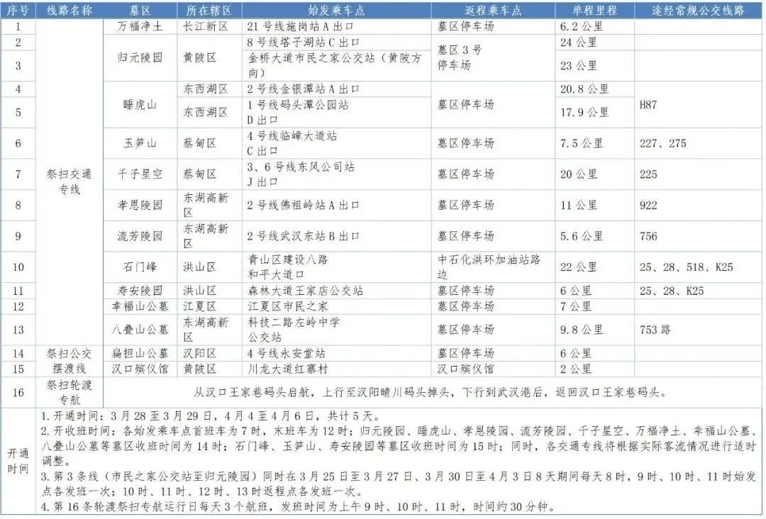 清明假期,武汉市将开通13条公交祭扫专线,覆盖全市多个主要墓区,同时开通1条祭扫轮渡专线。建议广大市民尽量选择乘坐公交出行,错峰避堵。