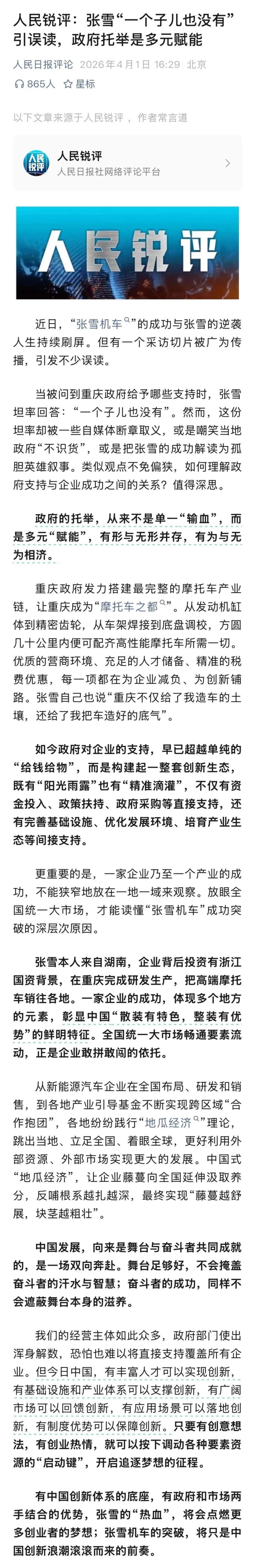 4月1日,人民日报社网络评论平台发表文章《张雪“一个子儿也没有”引误读,政府托举是多元赋能》,以下为全文: