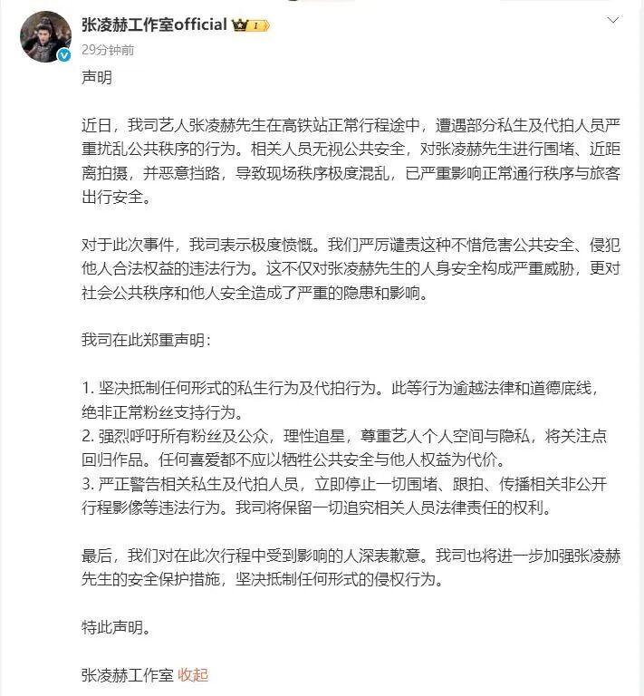近日,我司艺人张凌赫先生在高铁站正常行程途中,遭遇部分私生及代拍人员严重扰乱公共秩序的行为。相关人员无视公共安全,对张凌赫先生进行围堵、近距离拍摄,并恶意挡路,导致现场秩序极度混乱,已严重影响正常通行秩序与旅客出行安全。