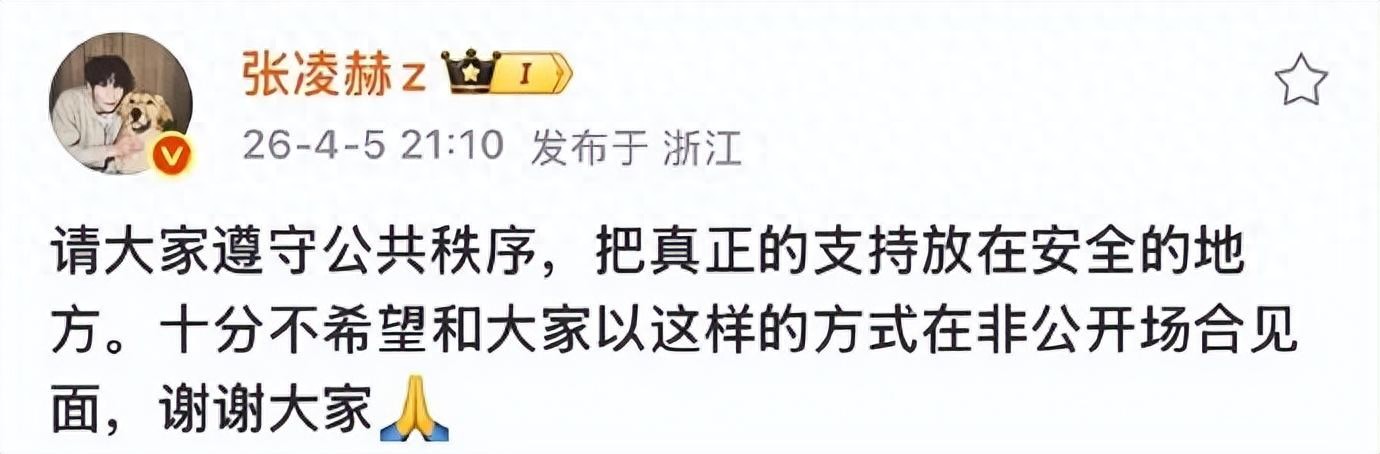 演员张凌赫对声明内容进行转发提醒,“请大家遵守公共秩序,把真正的支持放在安全的地方。十分不希望和大家以这样的方式在非公开场合见面,谢谢大家”。