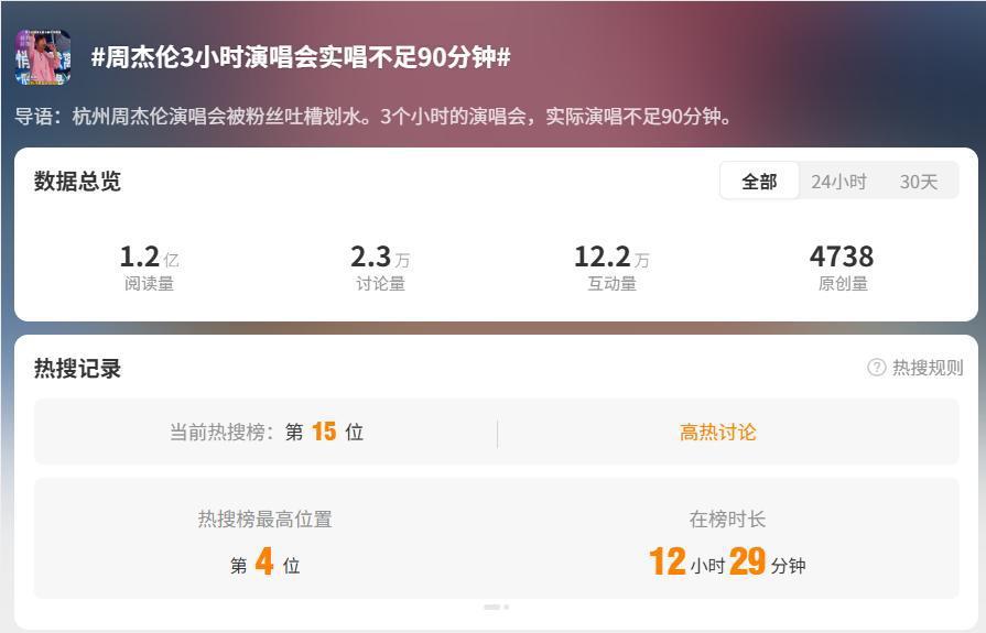 4月6日,周杰伦杭州演唱会被指划水的词条登上微博热搜,“周杰伦3小时演唱会实唱不足90分钟”话题词最高热搜第四,阅读量达到1.2亿。