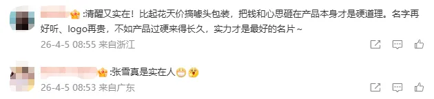 张雪的务实言论获网友点赞,大家纷纷表示“把钱花在刀刃上”“叫什么无所谓,做什么才重要”, 还有网友说:“清醒又实在!比起花天价搞噱头包装,把钱和心思砸在产品本身才是硬道理。名字再好听、logo再贵,不如产品过硬来得长久,实力才是最好的名片”。