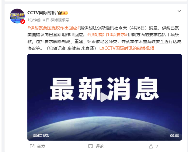 总台记者当地时间6日从伊朗方面获悉,伊朗已就美国提出的结束战争的提议向巴基斯坦作出回应。