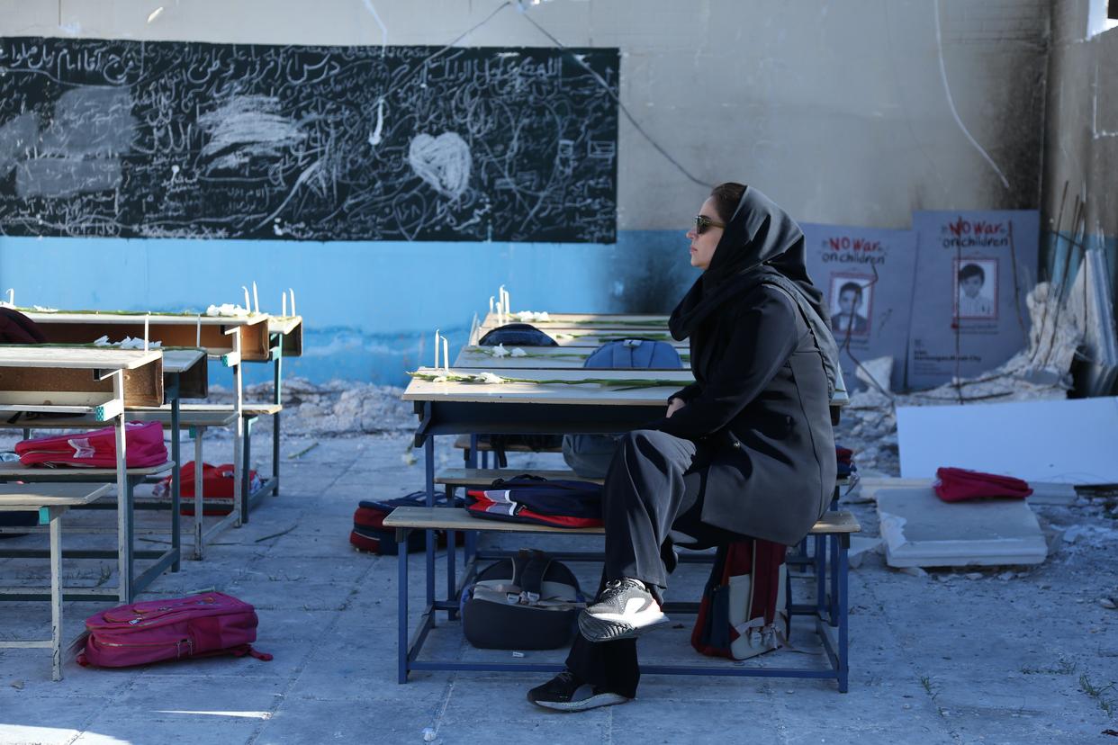 4月6日,在伊朗首都德黑兰,一名妇女坐在小学教室遭袭的场景内,悼念遭美以空袭遇难的米纳卜小学学生。新华社记者 沙达提 摄