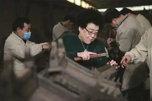 陈丽华女士示范安装影壁上的吞脊兽(来源:中国紫檀博物馆)