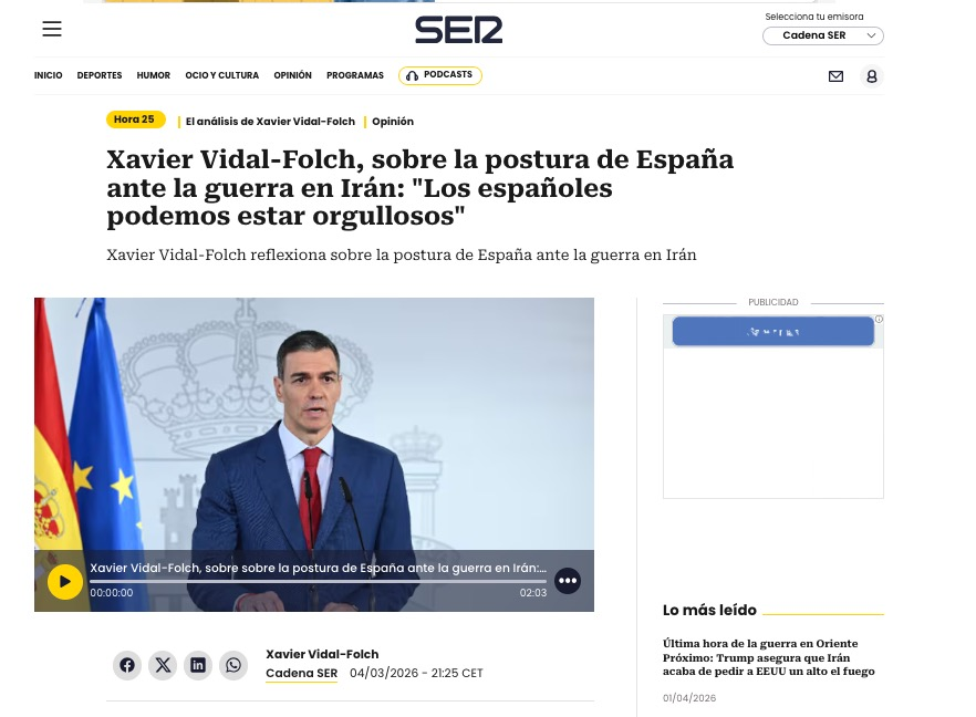 西班牙主流媒体西班牙广播公司在评论文章中对政府立场给予了明确肯定,认为这一选择既坚定也具有正当性。文章指出,桑切斯政府拒绝卷入这场战争,体现了对国际法的尊重。