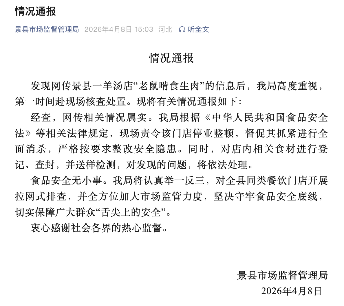 4月8日,河北衡水景县市场监督管理局针对网传一羊汤店“老鼠啃食生肉”发布情况通报:经查,网传相关情况属实。我局根据《中华人民共和国食品安全法》等相关法律规定,现场责令该门店停业整顿,督促其抓紧进行全面消杀,严格按要求整改安全隐患。同时,对店内相关食材进行登记、查封,并送样检测,对发现的问题,将依法处理。