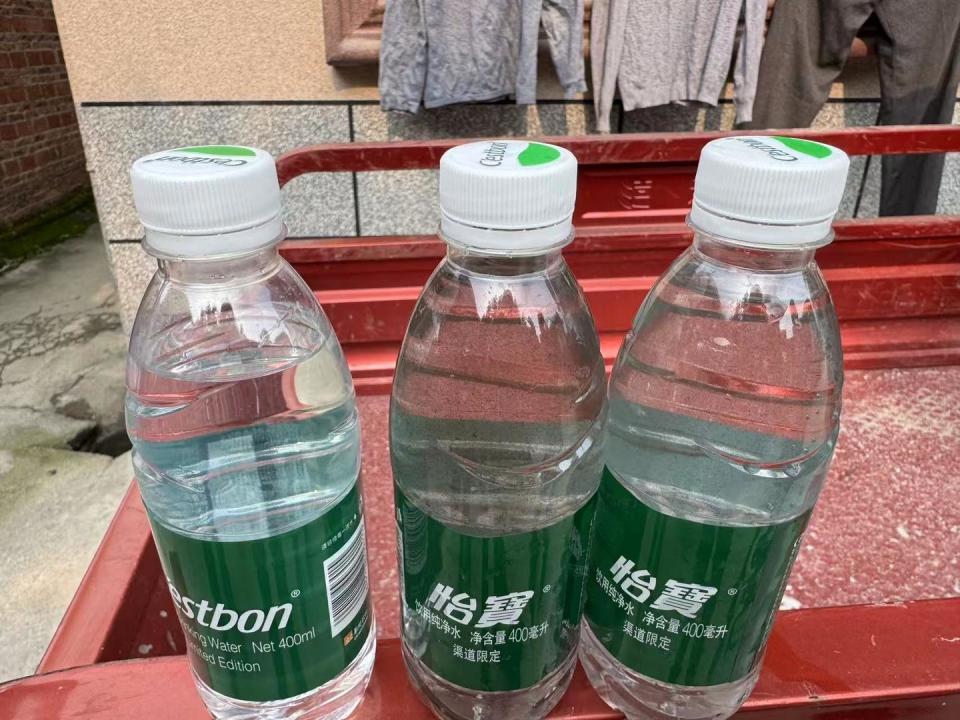 ▲记者从水管里接到矿泉水瓶的水体,左一为正常矿泉水作为对比,中间和右一为不同时间段所接水体,细看都有悬浮物祁彪 摄