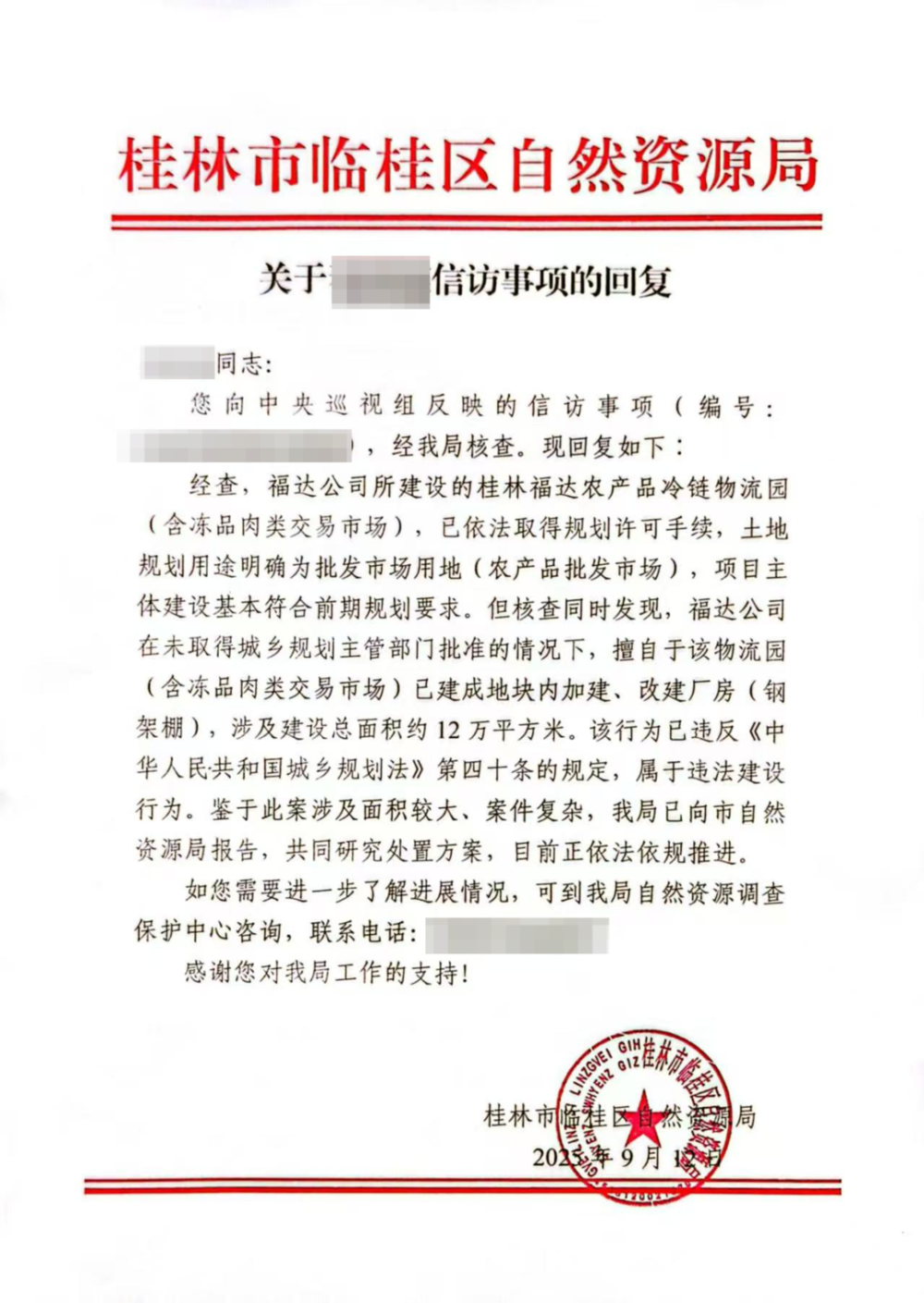 2025年9月,针对福达公司的违法建设行为,临桂区自然资源局在给信访人的一份信访回复显示:经核查,福达公司在未取得城乡规划主管部门批准的情况下,擅自于该物流园已建成地块内加建、改建厂房(钢架棚),涉及建筑总面积约12万平方米,该行为已违反相关法律规定,属于违法建设行为。鉴于此案涉及面积较大、案件复杂,该局已向市自然资源局报告,共同研究处置方案,目前正依法依规推进。