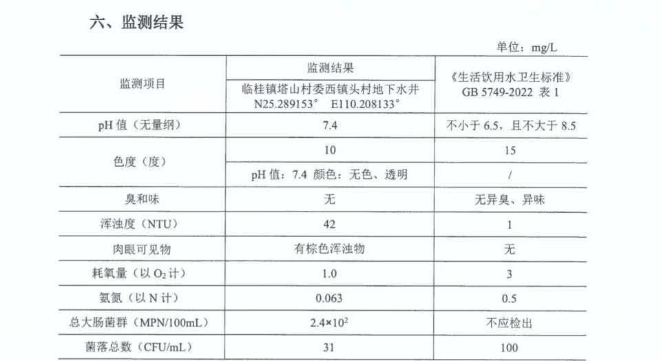西镇头村一位受访村民向红星新闻记者提供了一份其委托水质检测机构经水样检测出具的检测报告,报告显示水样浑浊度为42,报告引用的《生活饮用水卫生标准》规定的浑浊度数值为“1”,在肉眼可见物一栏,报告载明有棕色浑浊物,按照标准应为无;总大肠杆菌一栏水样检测结果为2.4×10²MPN/100ml,而按照标准不应检出。