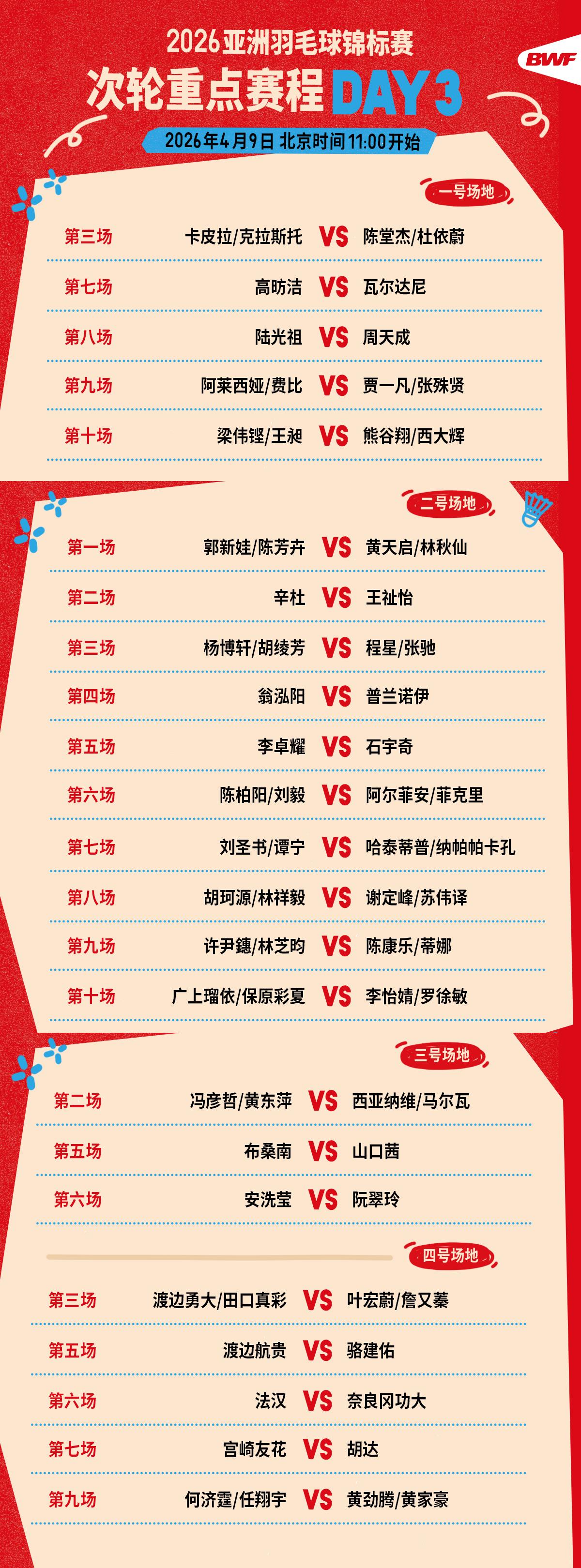 2026羽毛球亚锦赛第三日赛程公布 中午11时开打