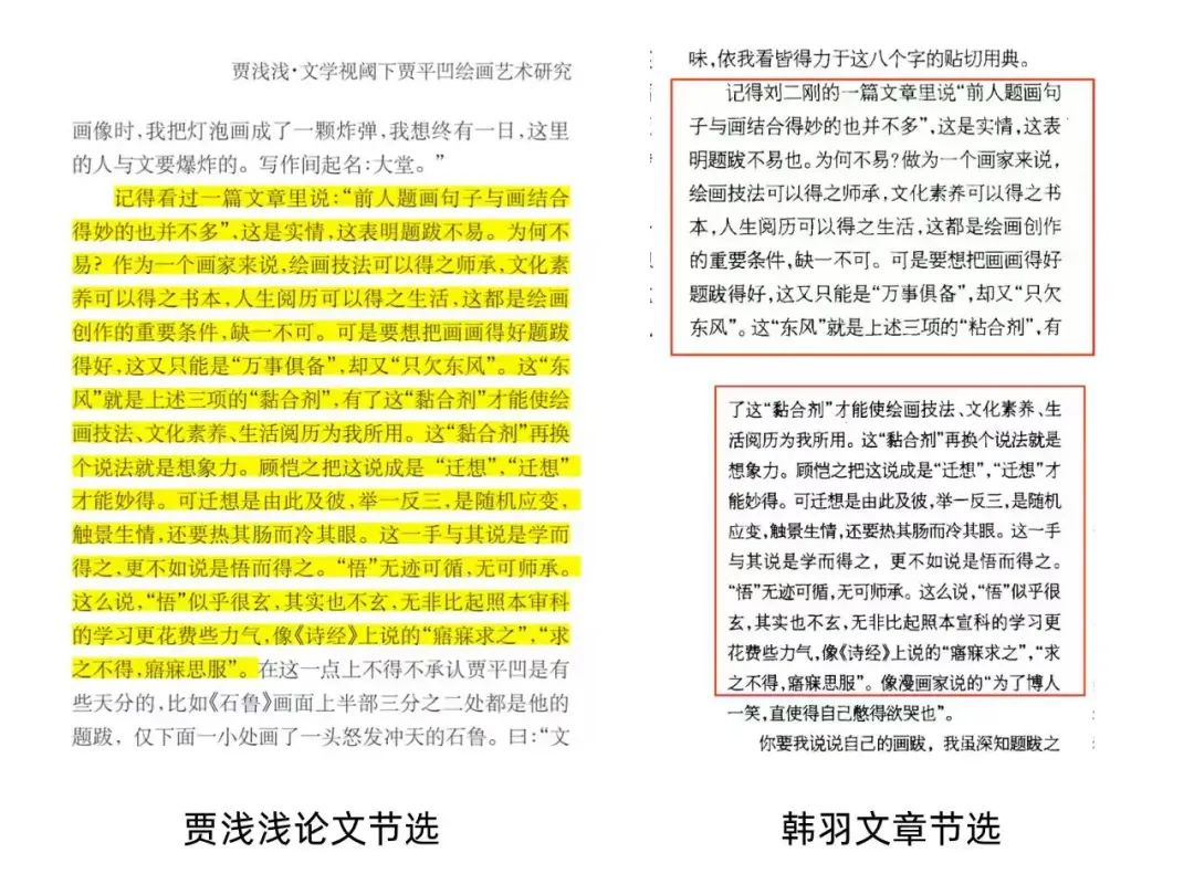 根据网友的爆料,羊城晚报记者在知网和维普网中找到这两篇文章进行比对后发现,贾浅浅的论文中重合段落集中在第三部分第四节“绘画的题跋运用意义”,其中用了大量篇幅分析贾平凹的作品、引用贾平凹的话语,而“题跋、印章入画,成为中国画的独有形式。题跋之于绘画,除了形式方面,更重要的在于传达神韵,绝不是无关痛痒的一首诗、几句话所能奏其功的”等论述皆与韩羽的文章有重合,但贾浅浅并未在该论文中注明引用,存在整段照搬的情况。