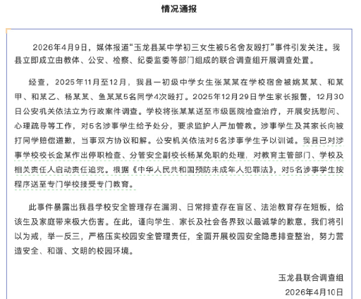 4月10日,云南玉龙县联合调查组发布情况通报: 2026年4月9日,媒体报道“玉龙县某中学初三女生被5名舍友殴打”事件引发关注。我县立即成立由教体、公安、检察、纪委监委等部门组成的联合调查组开展调查处置。