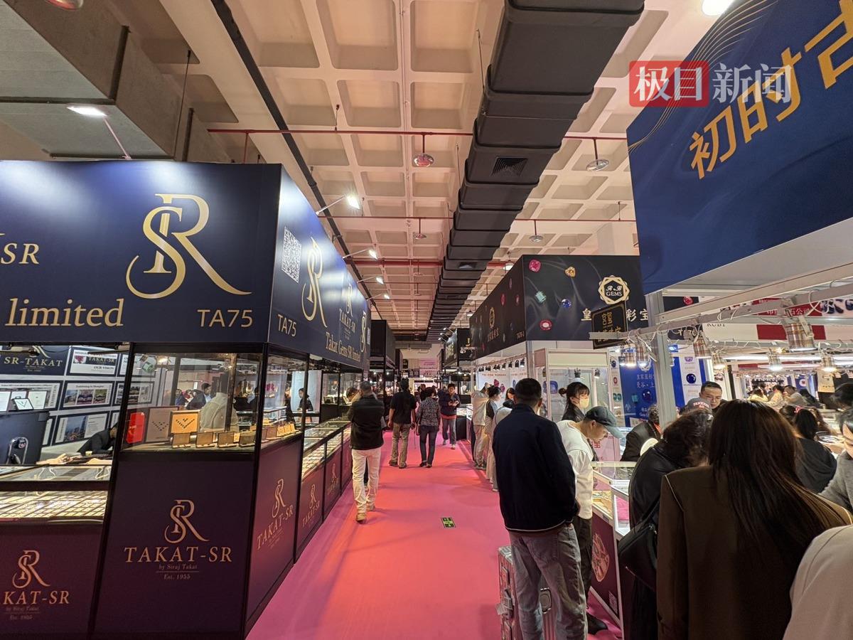 10日下午,极目新闻记者在展会现场看到,彩色宝石、珍珠、玉石和翡翠等展馆人头攒动,不少市民在展柜前驻足挑选珠宝首饰。