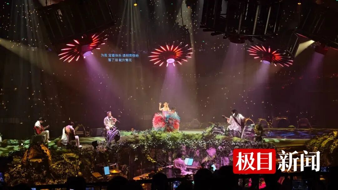 极目新闻记者在现场看到,本场演唱会舞台设计采用全景四面台,以“绿色群岛”为概念,结合沉浸式投影,舞美效果颇为震撼。