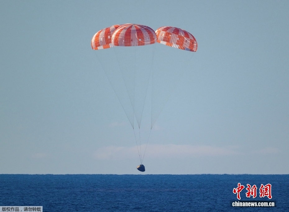据美国航空航天局当地时间10日消息,执行美国“阿耳忒弥斯2号”载人绕月飞行任务的“猎户座”飞船当晚返回地球,在加利福尼亚州圣迭戈附近海域溅落。图为“猎户座”飞船在加利福尼亚州圣迭戈附近海域溅落。
