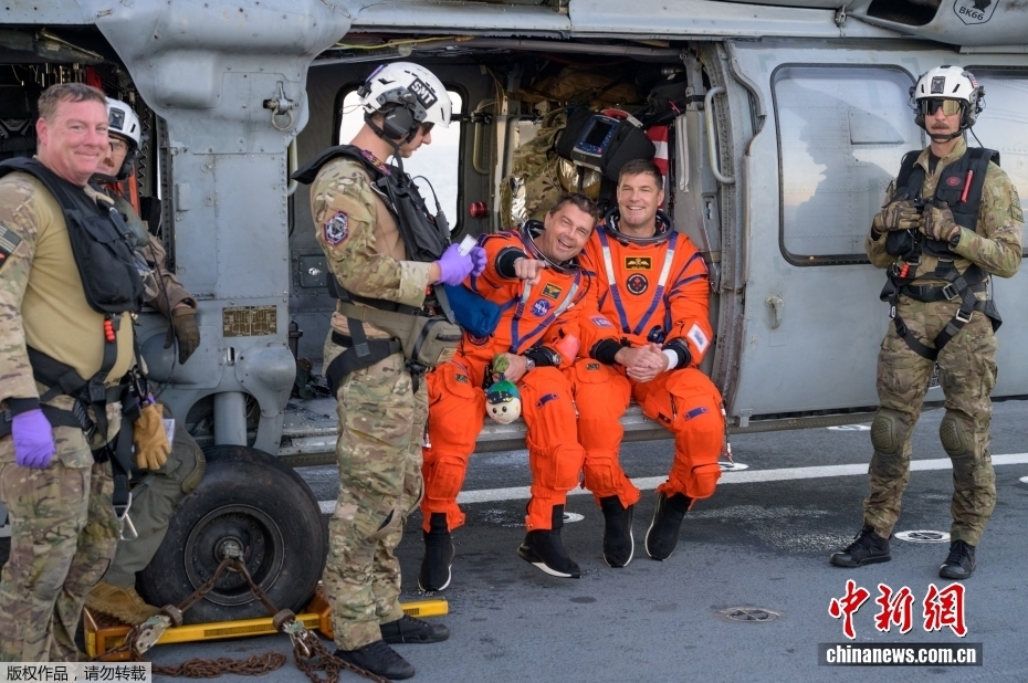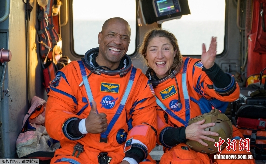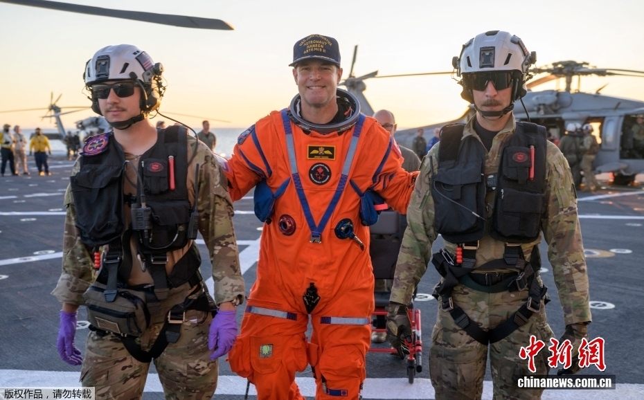 据美国航空航天局当地时间10日消息,执行美国“阿耳忒弥斯2号”载人绕月飞行任务的“猎户座”飞船当晚返回地球,在加利福尼亚州圣迭戈附近海域溅落。图为宇航员出舱后抵达“约翰·P·默萨”号(USS John P. Murtha)海军船坞运输舰上。