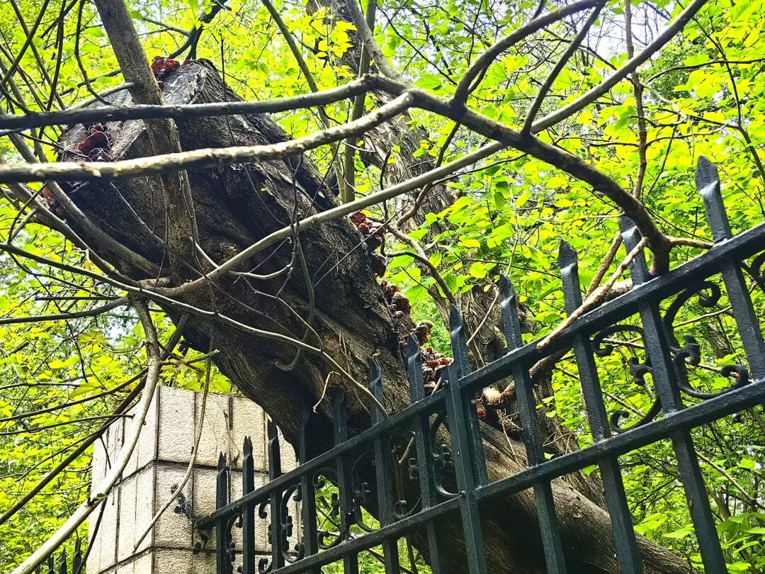 4月12日上午,长江日报记者在江岸区建设大道看到,一座居民小区临街院墙边长着一株高大的构树,有一截枯枝的表皮和断面在雨后长出不少棕色的木耳,看上去鲜嫩水灵。