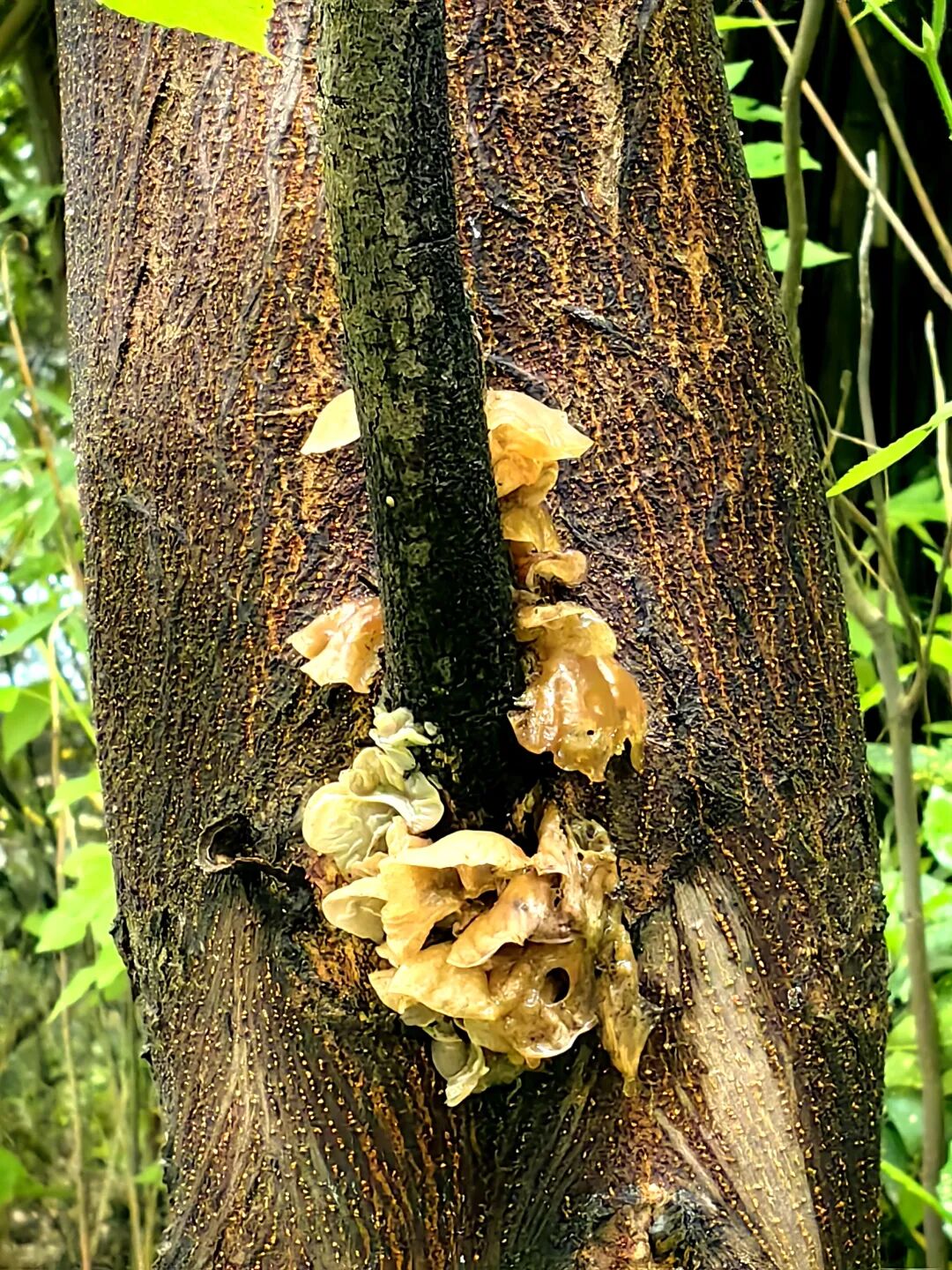 附近还有一株构树,树干上也长着一些木耳,但颜色泛白。
