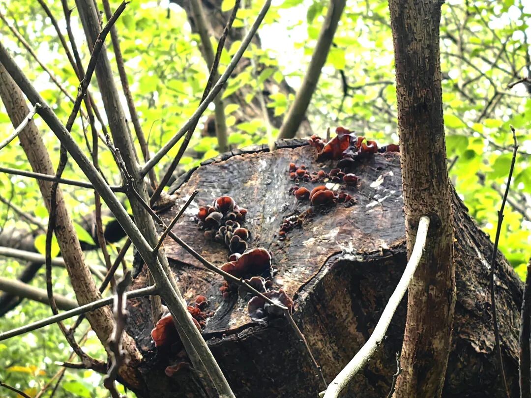 构树枯枝断面长出的木耳。记者明眺生 摄