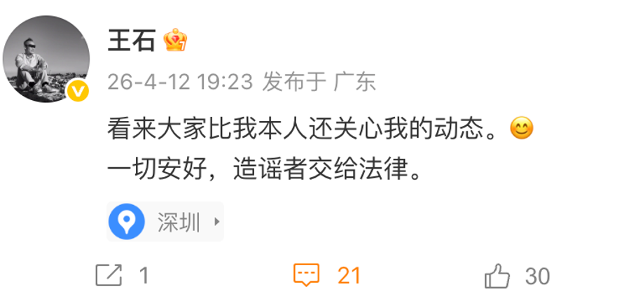 @王石 也发文回应“看来大家比我本人还关心我的动态。一切安好,造谣者交给法律。”