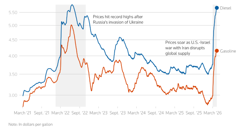 △自美以对伊朗军事打击以来,美国燃油价格大幅飙升。