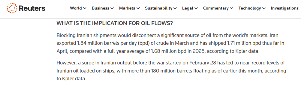 路透社援引Kpler数据称,伊朗3月原油出口为184万桶/日,4月迄今约为171万桶/日;若封锁长期化,全球市场将少掉大约200万桶/日的伊朗原油供应。报道同时提到,海上仍有超过1.8亿桶伊朗原油在海上处于浮仓状态,波斯湾水域内还有约187艘满载油轮滞留。
