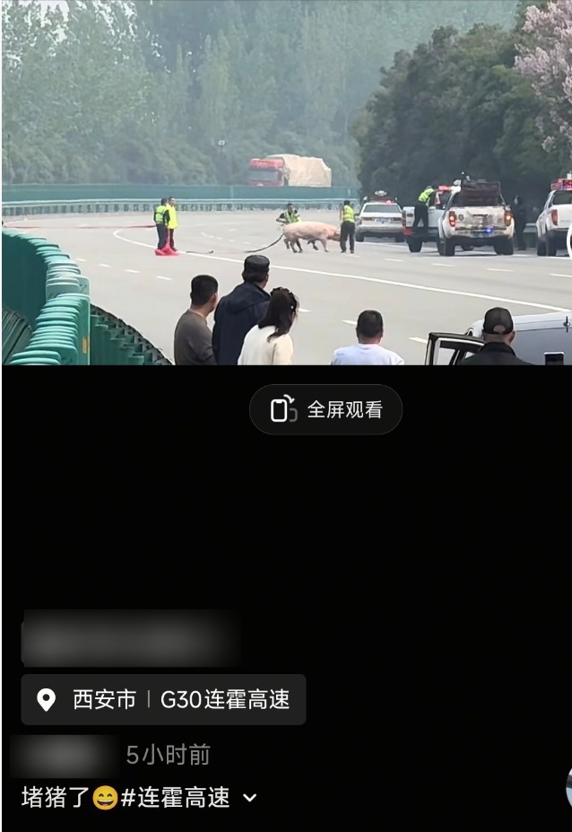 14日下午,一名现场目击者告诉极目新闻记者,这段视频是在连霍高速西安至郑州方向的渭南境内拍摄的,事发时间是14日上午10时左右。因抓捕这头猪,现场堵了20分钟左右,随后,工作人员将猪赶到高速路旁,道路就放行了。