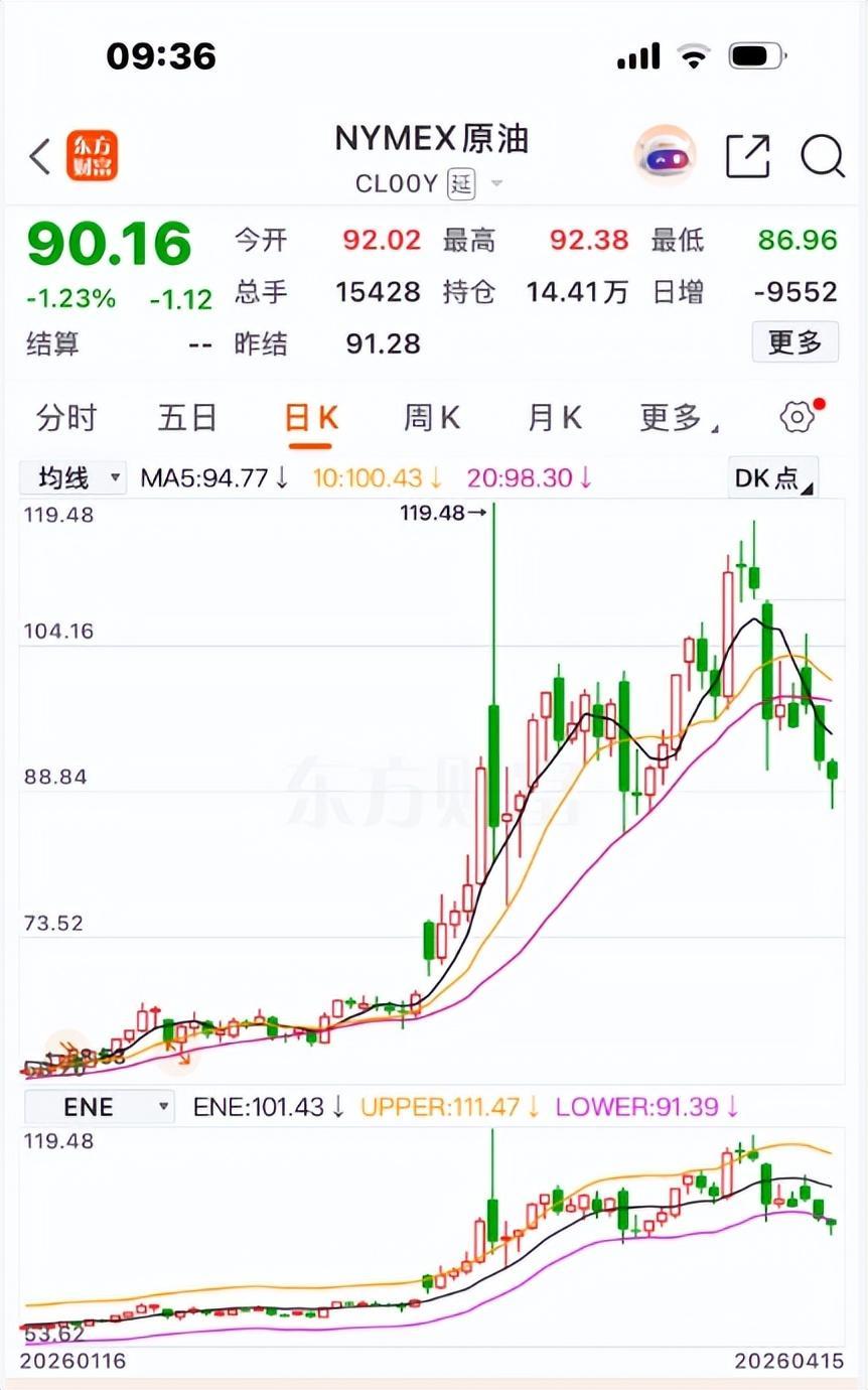 美伊正寻求第二轮和谈,据央视新闻消息,美国总统特朗普更是在最新采访中表示,美国对伊朗的战争已经“结束”。4月14日,国际油价应声大幅回落。纽约原油期货收盘跌7.08%,报92.07美元/桶;布伦特原油期货收盘跌4.05%,报95.34美元/桶。4月15日开盘后,纽约原油期货更是一度跌破90美元/桶大关,最低跌至86.96美元/桶。而就在一周前,纽约、布伦特原油期货一度双双站上110美元/桶大关。