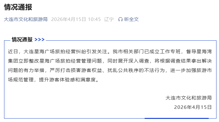 4月15日,辽宁大连市文化和旅游局发布情况通报: