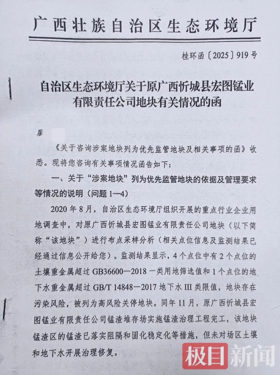 据2025年9月广西壮族自治区生态环境厅发给廖先生的一份函件显示,2020年8月,自治区生态环境厅组织开展的重点行业企业用地调查中,对原宏图锰业地块进行布点采样分析。监测结果显示,4个点位中有2个点位的土壤重金属超标,1个点位的地下水重金属超过限值,地块存在污染风险,被列为高风险关停地块。同年11月,原宏图锰业公司锰渣堆存场实施锰渣治理工程完工,该地块锰渣区的锰渣已落实阻隔和固化稳定化等措施,但未对场区土壤和地下水开展治理修复。