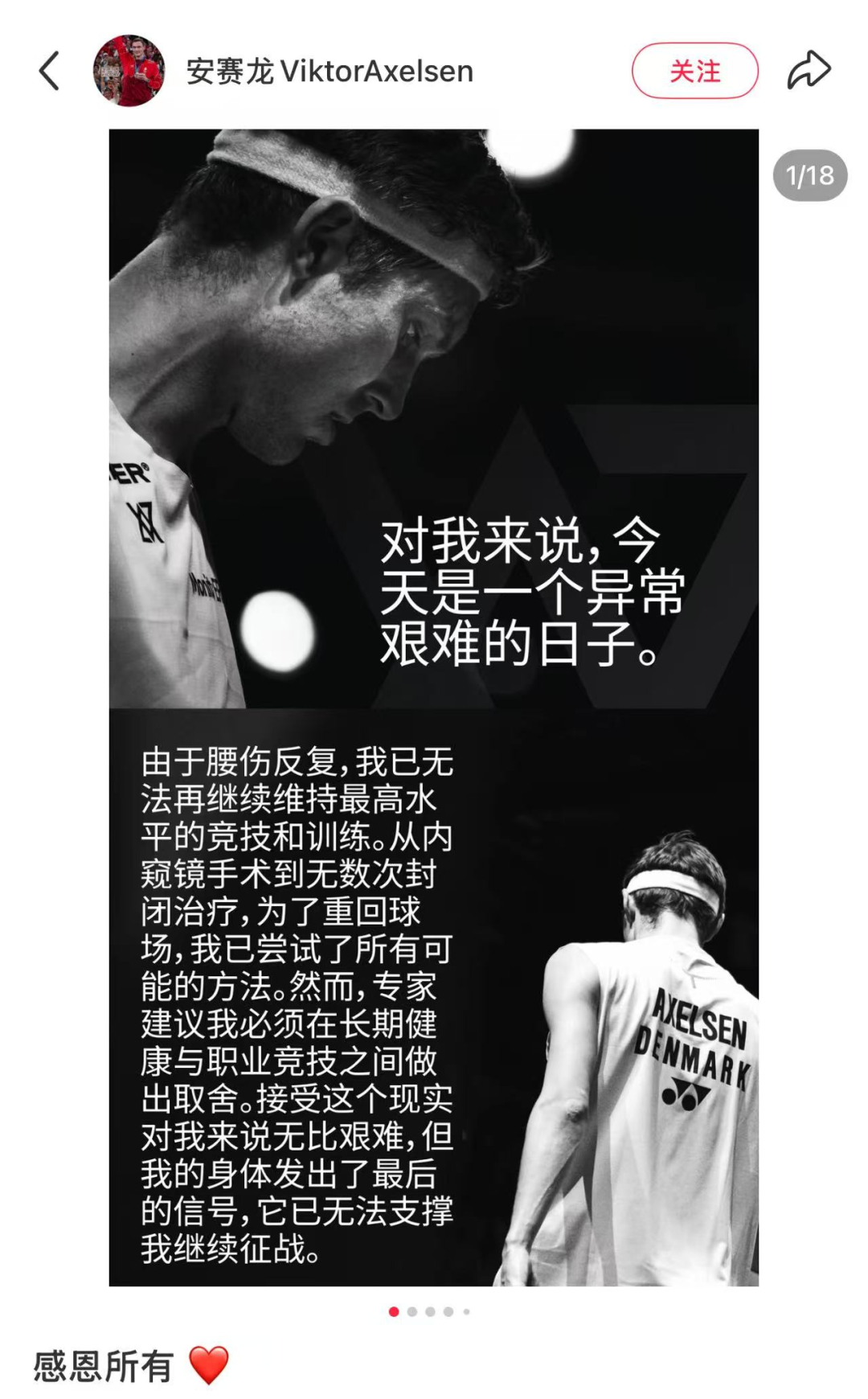 刚刚,羽毛球运动员安赛龙发文宣布退役: