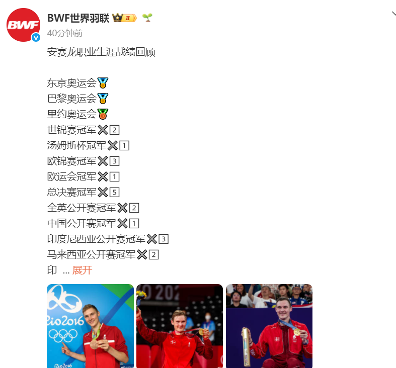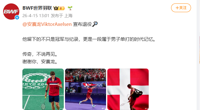 随后,世界羽联也在官方发布了此消息,并配文:“他留下的不只是冠军与纪录,更是一段属于男子单打的时代记忆。传奇,不说再见。谢谢你,安赛龙。”