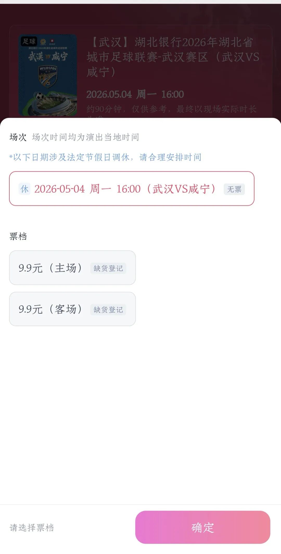 4月15日上午10:00,湖北银行2026年湖北省城市足球联赛(简称“楚超”)武汉华工科技队主场首战门票正式开售,门票上架仅20分钟,万张门票便被一抢而空。
